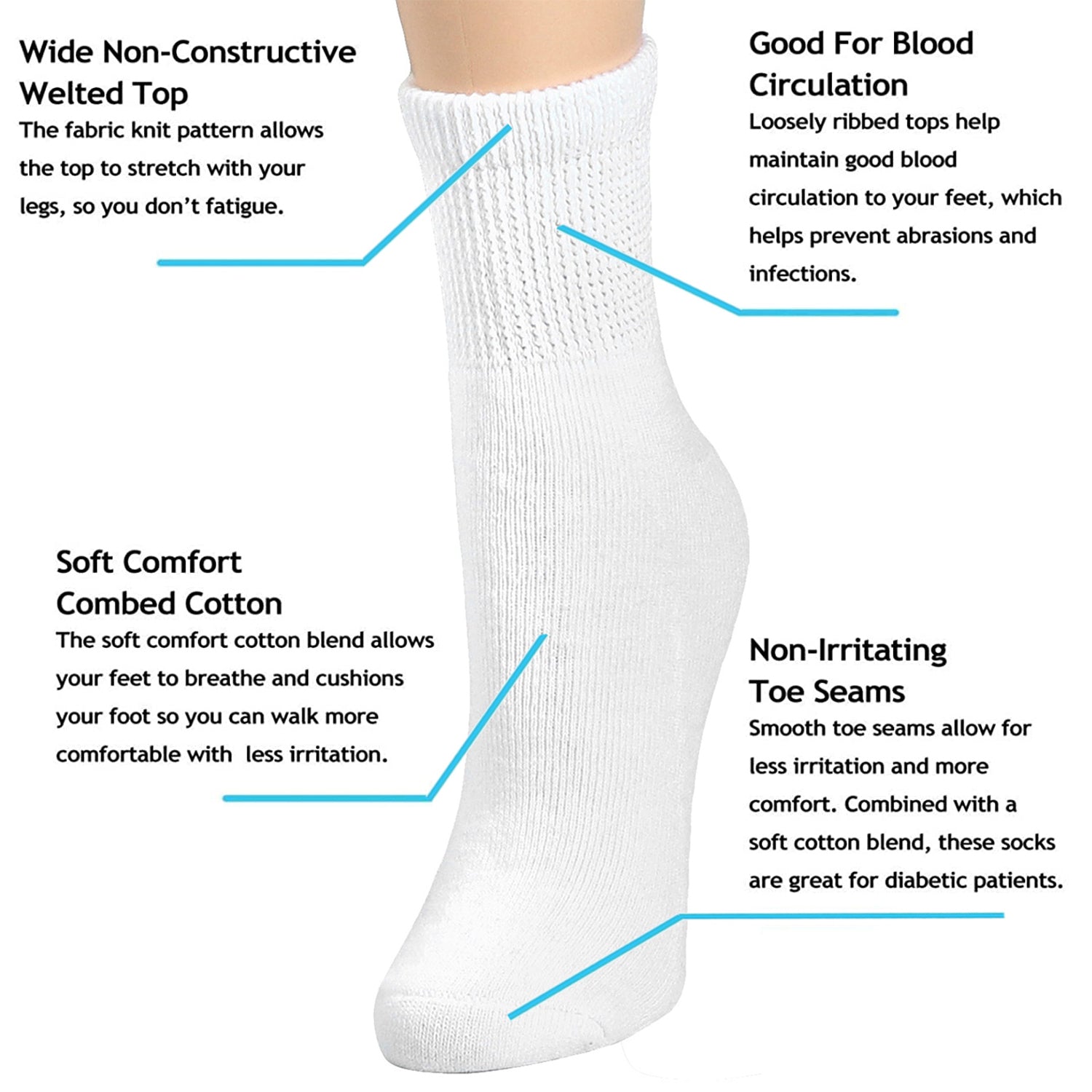 Socks Designed: Loose fitting, non-binding top, increased blood circulation, non-irritating toe seams, and soft comfort combed cotton. The best thing is to help you live healthy and stay pain free.